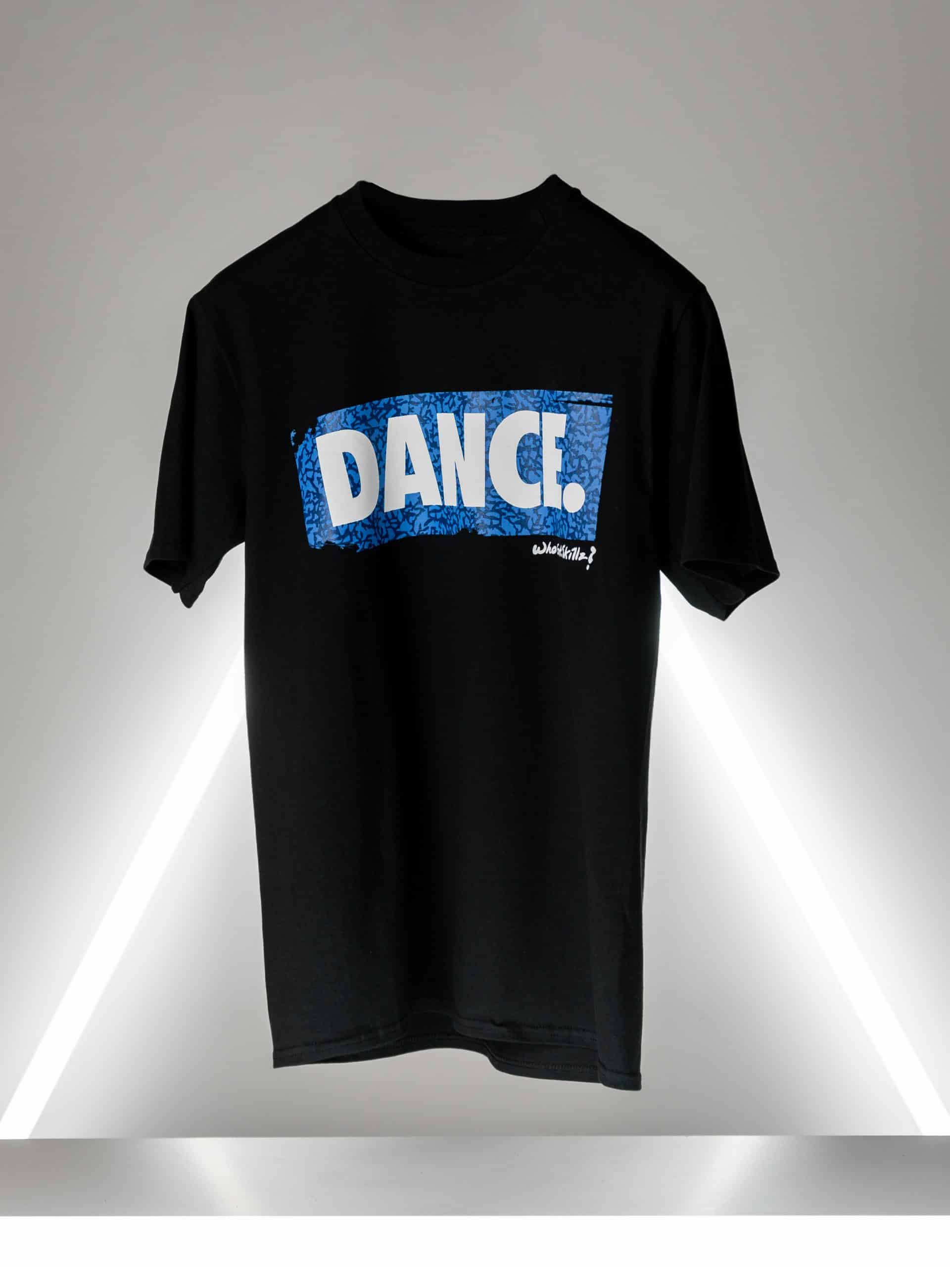WGS Originals MIDNIGHT BLUE DANCE features a premium cotton T-SHIRT in BLACK. Our signature DANCE design with a dark BLUE twist for endless nights of dancing … in the club or at the gym.